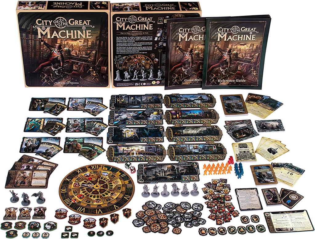 City of the Great Machine is a One-vs-Many and Cooperative strategy game set in the Victorian steampunk universe. The game features a conflict between an alliance of Heroes and the Great Machine, a single-player artificial intelligence network. The Great Machine controls the City built on mobile sky platforms. As the Great Machine, one player (or game AI in the Solo & Coop mode) commands a force of engineered servants and mechanical guards. The Great Machine’s ultimate goal is to complete its grandiose Master Plan and perfect mankind. All other players are Heroes working together against the Great Machine to start a revolution. Their goal is to prevent the Great Machine from completing its Master Plan,thus saving humanity from eternal enslavement.