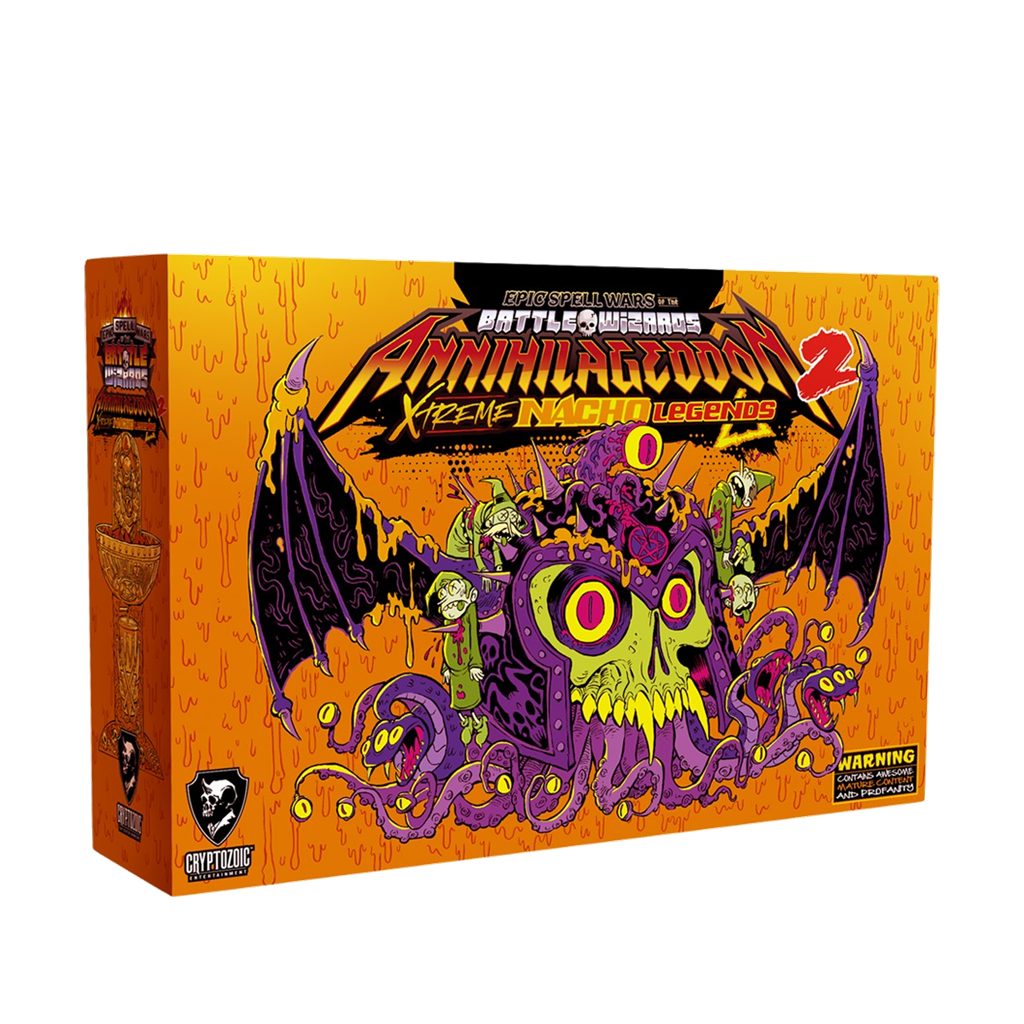 Step back into the outrageous world of Annihilageddon with "Epic Spell Wars of the Battle Wizards: Annihilageddon 2 – Xtreme Nacho Legends," the latest deck-building game from Cryptozoic Entertainment that escalates magical chaos to extreme levels. Prepare yourself for an explosion of nacho-spiced destruction as you vie for dominance in the most intense arena ever conjured!