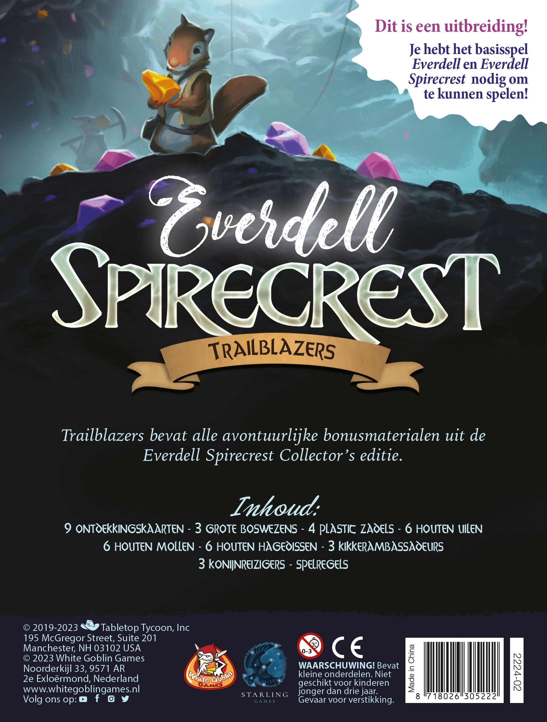 Heb je Everdell en Everdell Spirecrest in je bezit? Upgrade hem dan met de collector’s editie Trailblazers. In deze upgrade vind je extra speelkaarten en luxe speelstukken.