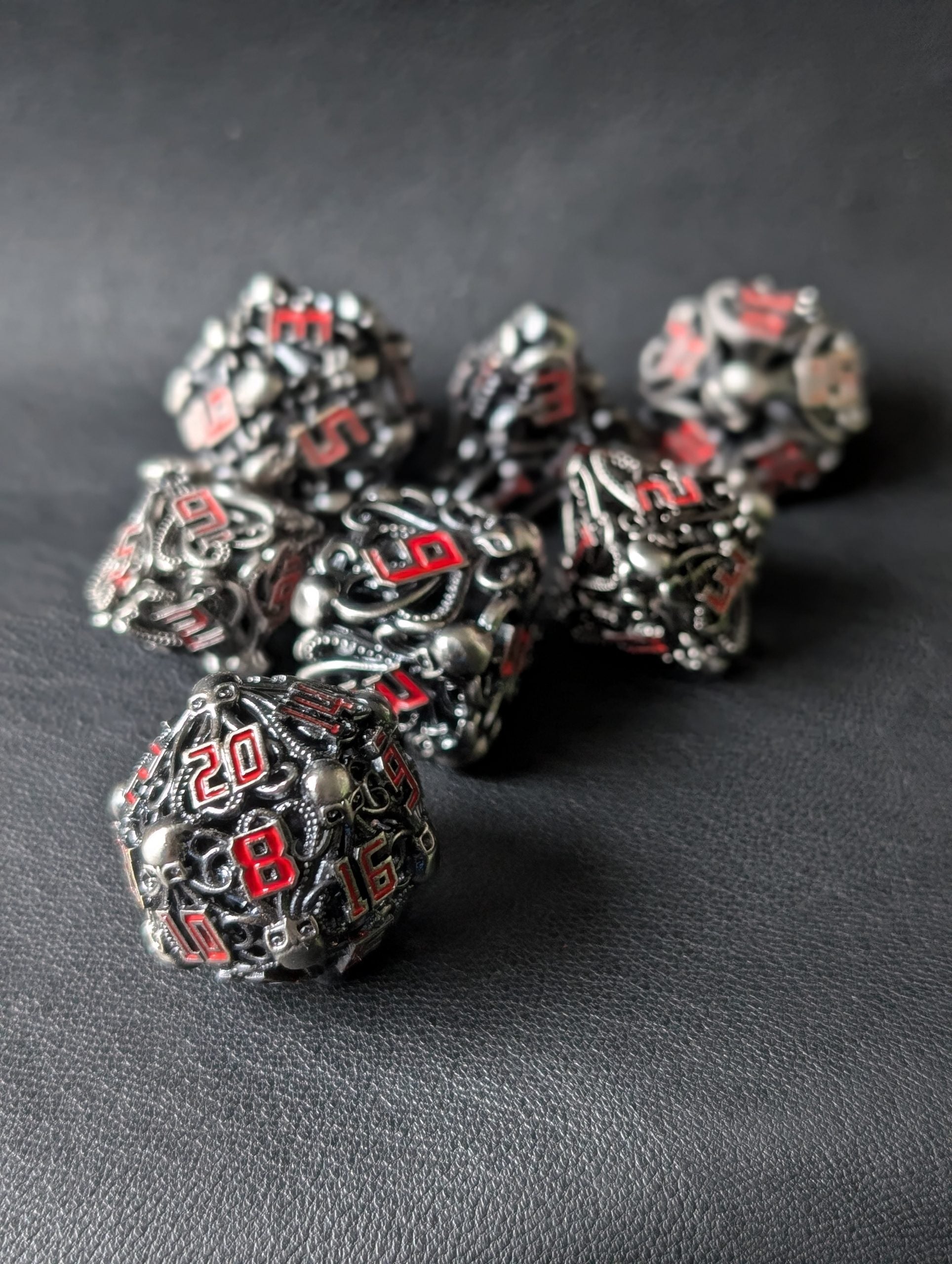 Duik in de wereld van avontuur met de Kraken’s Hold dice set. Deze hollow metal dobbelstenen zijn versierd met gedetailleerde octopusontwerpen op de hoeken en opvallende rode cijfers. Het holle ontwerp zorgt voor een lichtgewicht gevoel, terwijl de stevige constructie zorgt voor duurzaamheid.
