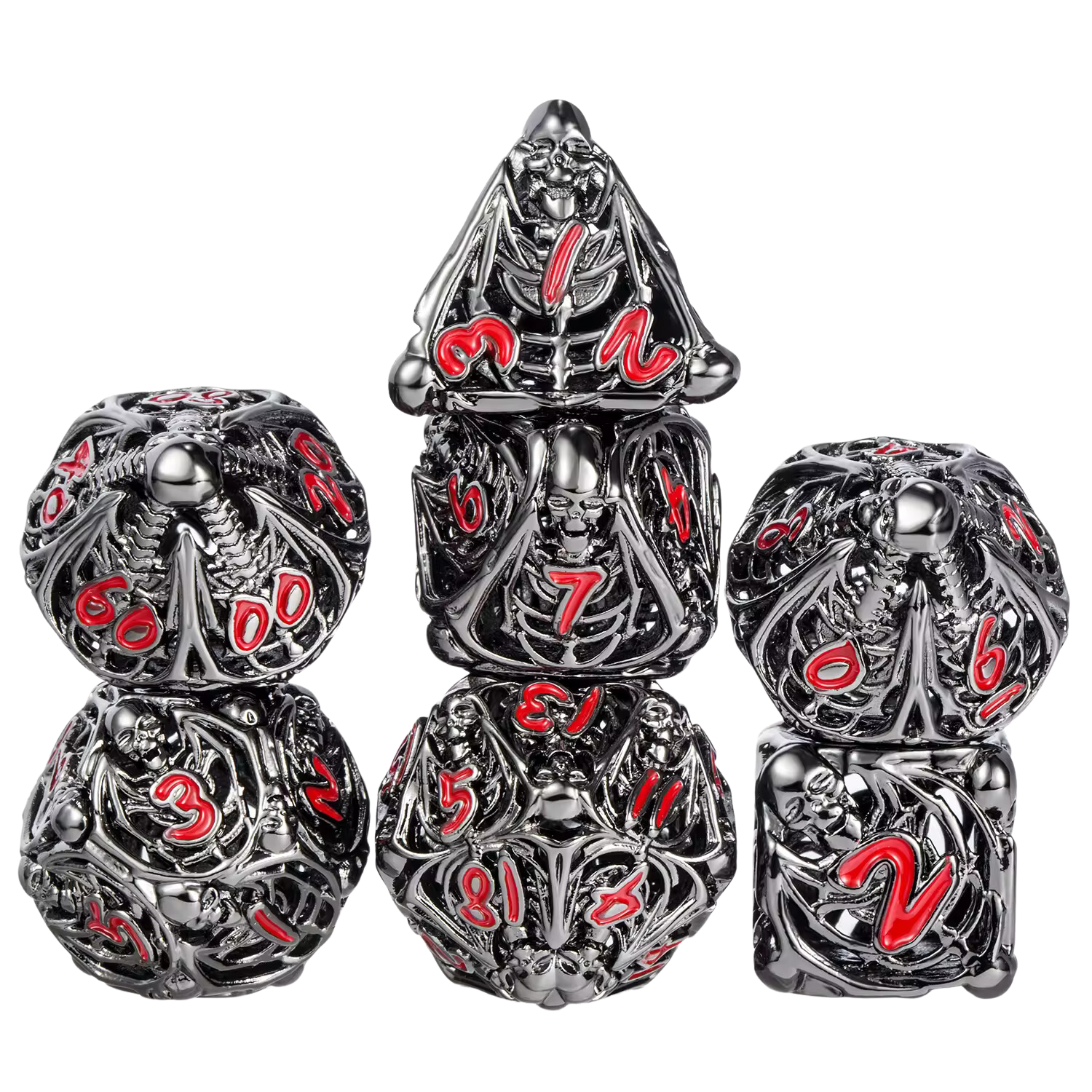 Voel de duistere kracht van de "Necromancer's Call" dnd dice set, speciaal ontworpen voor de ware liefhebbers van Dungeons & Dragons die durven te flirten met de duisternis. Elk van deze metalen dobbelstenen is versierd met fijn uitgewerkte skeletten op elke zijde, waardoor ze niet alleen een griezelige uitstraling hebben, maar ook een gewichtige rolervaring bieden. Deze set is jouw perfecte bondgenoot in het oproepen van de ongeziene krachten. Durf jij de Necromancers Call te beantwoorden en je lot in eigen handen te nemen? Laat deze dobbelstenen de gids zijn in jouw meest betoverende avonturen.