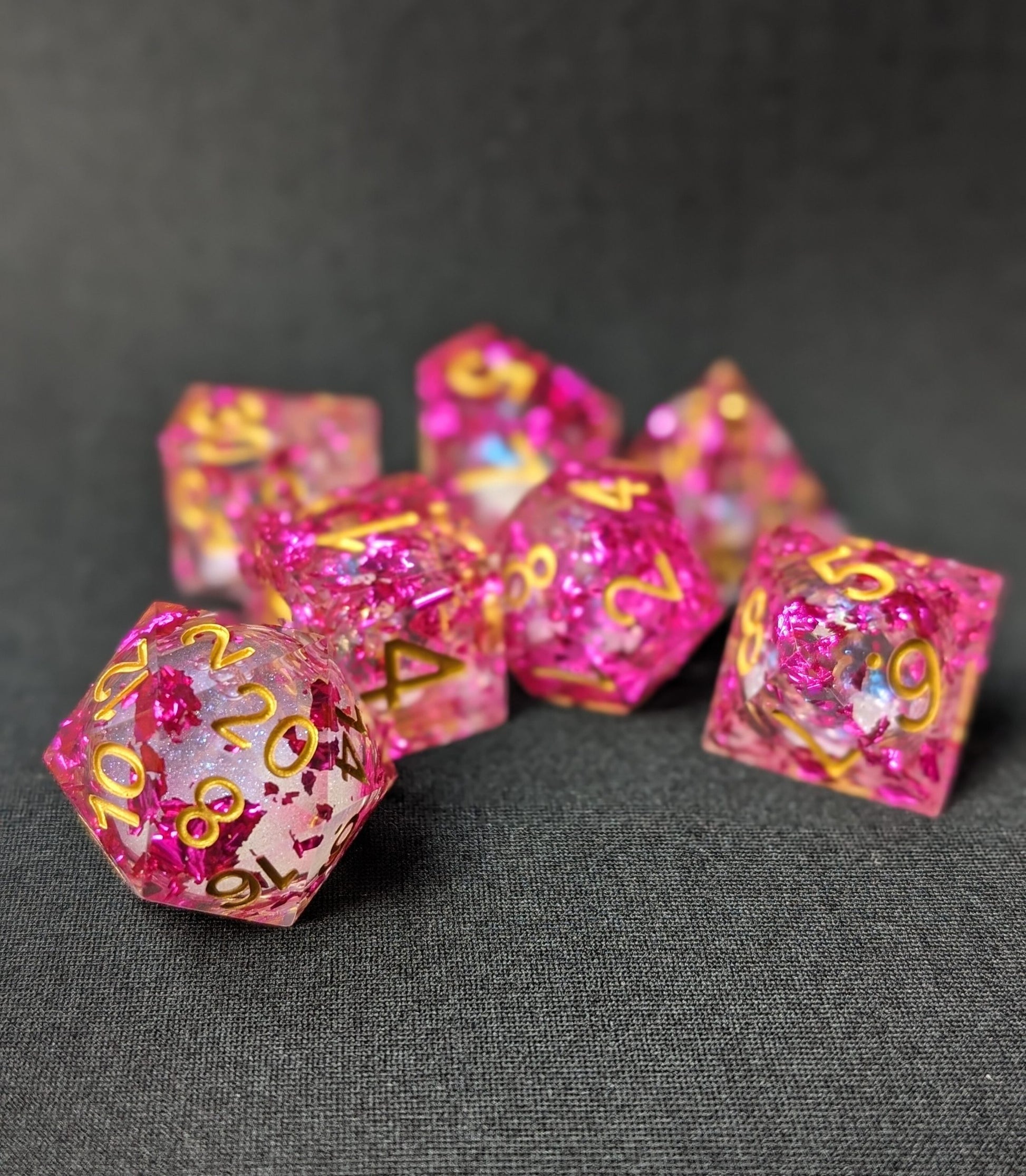 Ontdek de betoverende Rosy Blossom Dice Set, speciaal ontworpen voor RPG-liefhebbers die een vleugje romantiek en elegantie aan hun avonturen willen toevoegen. Deze unieke dobbelstenen hebben een vloeibare kern met delicate roze flakes die doen denken aan de schoonheid van rozenblaadjes die in de wind dwarrelen. Elke worp met deze dobbelstenen voelt magisch en bijzonder aan, alsof je door een bloementuin wandelt tijdens het spelen van je favoriete rollenspel.