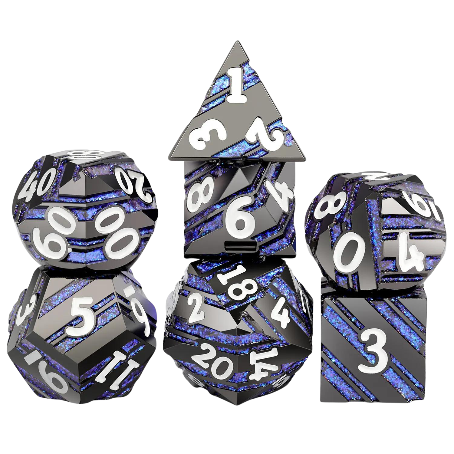 Ontdek avontuur en magie met onze Metal Dice set voor Dungeons & Dragons. Deze betoverende dobbelstenen zijn een must-have voor avonturiers en een prachtige toevoeging aan je uitrusting. Vervaardigd met vakmanschap uit metaal, voegen ze gewicht en substantie toe aan je worpen, terwijl hun mysterieuze zwarte tint en verleidelijke blauwe glitterstrepen een indrukwekkende visuele impact hebben.