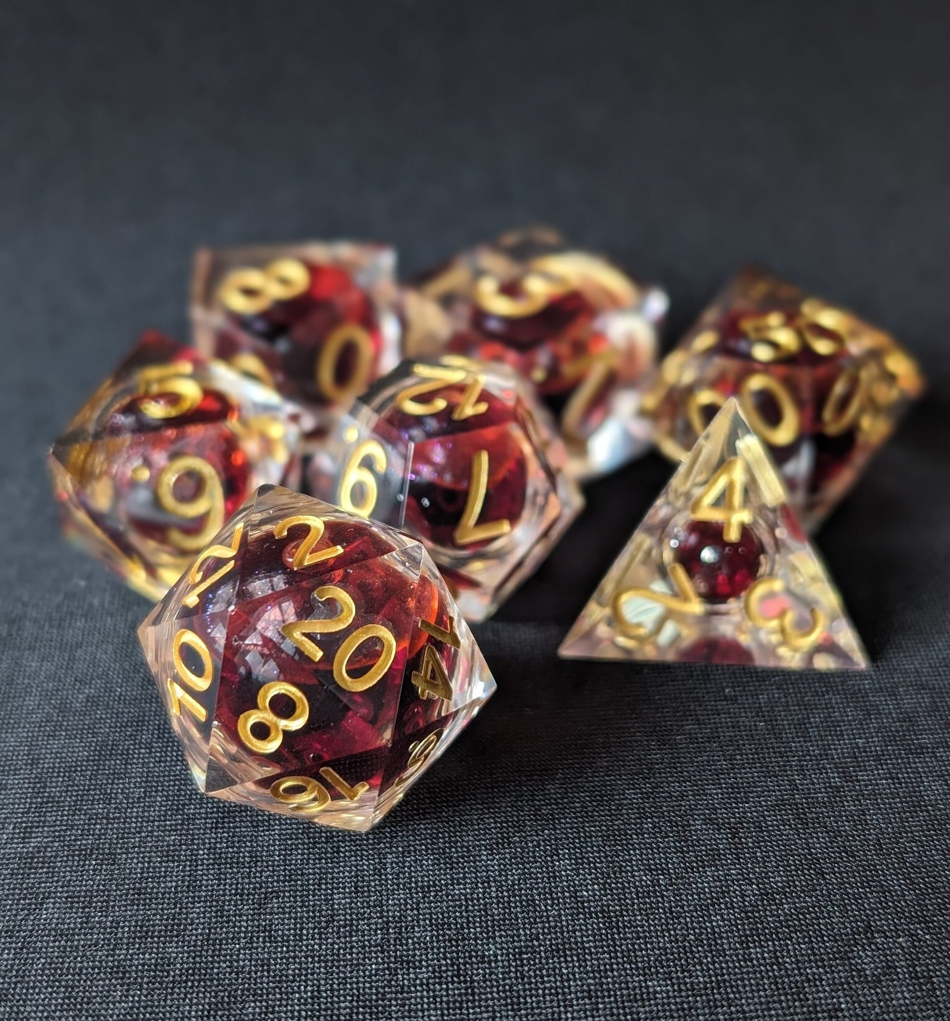 Betreed de duistere wereld van Vampire's Kiss met deze unieke DnD dobbelsteenset. Elke dobbelsteen heeft een vloeibare, bloedrode kern die bij elke worp elegant meebeweegt. Het diepe zwart van de buitenkant contrasteert prachtig met de rode vloeistof binnenin, wat een mysterieus en hypnotiserend effect creëert.
