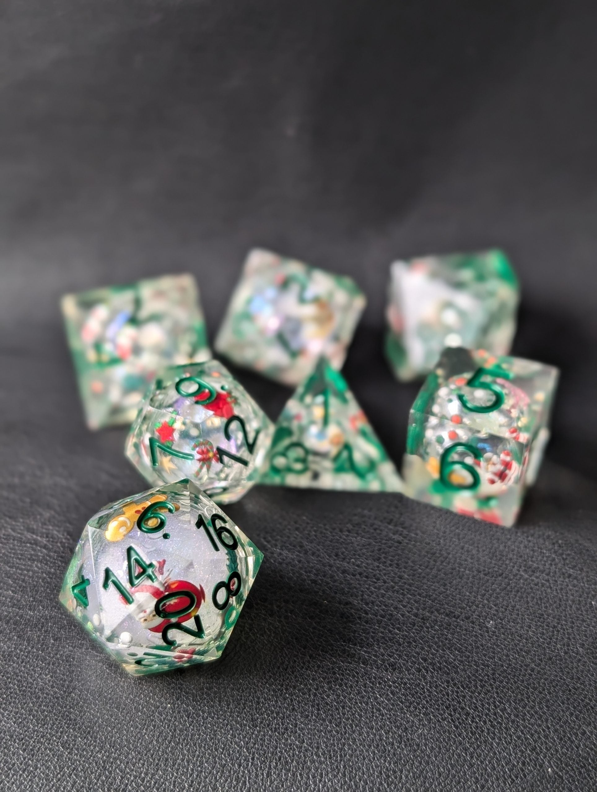 Winter Wonderland is een magische liquid core dice set die de betovering van het winterseizoen vastlegt. De set bevat schattige kerststickers, zoals een sneeuwpop, kerstman en gingerbread man, die de feestelijke sfeer omarmen. De groene cijfers voegen een vrolijke kleur toe, terwijl de parelmoer glitter in de liquid core een sprankeling van sneeuwvlokken nabootst.